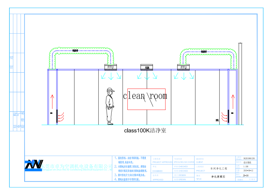 潔凈度的實現(xiàn)是通過布置在車間上的FFU高效過濾送風單元過濾,足夠的換氣次數(shù)來實現(xiàn)的,新風采用初效過濾后送入車間。